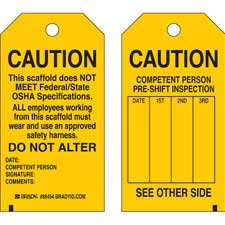 Brady CAUTION This Scaffold Does Not Meet Federal and State OSHA Specifications Do Not Alter Tags| Buy onlineOverviewScaffold Tags Our scaffold tags comply with OSHA's regulations and will help warn employees when scaffolding is not...