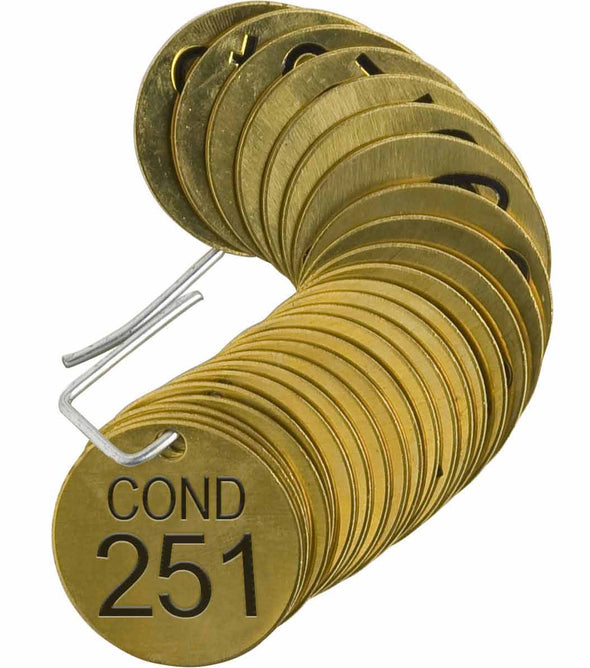 Stamped Brass Valve Tags COND Condensate 1-1/2 in. diameter stamped valve tags help you keep track of valves throughout your facility. Constructed from 19 gauge cartridge brass Black filled text for easy readability 1/4 in....