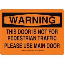 WARNING This Door Is Not For Pedestrian Traffic Please Use Main Door sign/ Buy Online Security and Admittance Signs Security, access and admittance signs identify restricted areas or alert employees of potential hazards. They include...