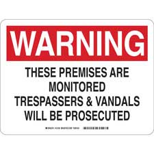 WARNING These Premises Are Monitored Trespassers & Vandals Will Be Prosecuted Sign/ Buy Online Security and Admittance Signs Security, access and admittance signs identify restricted areas or alert employees of potential hazards. They include legends...