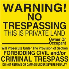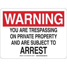 WARNING You Are Trespassing On Private Property And Are Subject To Arrest Sign/ Buy Online Security and Admittance Signs Security, access and admittance signs identify restricted areas or alert employees of potential hazards. They include...