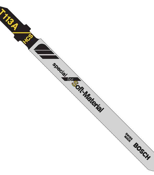 Bosch T113A Jigsaw Blades 2608635177 3pcs jigsaw blades HCS ground blade specifically manufactured for cutting cardboard 50mm, polystyrene insulation 50mm, carpet and leather 50mm plus rubber 50mm. T113A jigsaw blades are HCS ground finish with...