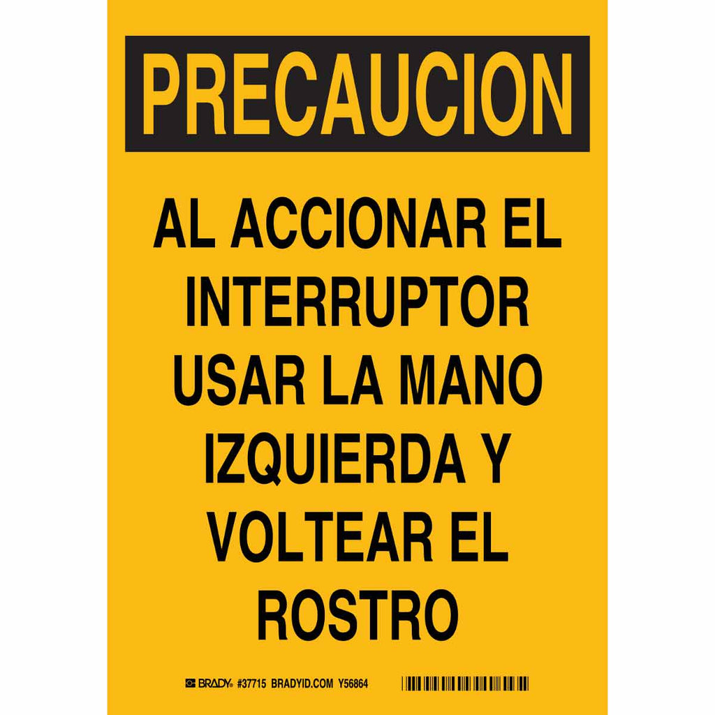 Brady PRECAUCION Al Accionar El Interruptor Usar La Mano Izquierda Y Voltear El Rostro Sign/ Buy online