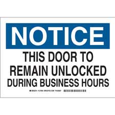 NOTICE This Door To Remain Unlocked During Business Hours Sign/ Buy Online Security and Admittance Signs Security, access and admittance signs identify restricted areas or alert employees of potential hazards. They include legends such as...