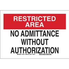 RESTRICTED AREA No Admittance Without Authorization Sign/ Buy Online Security and Admittance Signs Security, access and admittance signs identify restricted areas or alert employees of potential hazards. They include legends such as "Do Not Enter,"...