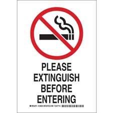 Please Extinguish Before Entering Sign/ Buy Online No Smoking Signs No Smoking signs will keep everyone in your facility safe and healthy by communicating to employees and visitors the areas where smoking is not allowed....