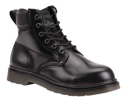 Black leather 6 eyelet safety boot with air cushion PVC outsole steel toecap and padded collar.