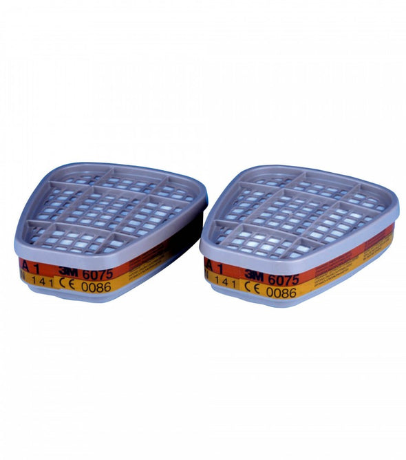 Pair of A1 Formaldehyde Filters to suit 3M™ Reusable Respirators (part number 6075). The 6075 filters provide protection against Organic Vapours and Formaldehyde. Organic Vapour (with a boiling point > 65°C) and Formaldehyde protection A1...